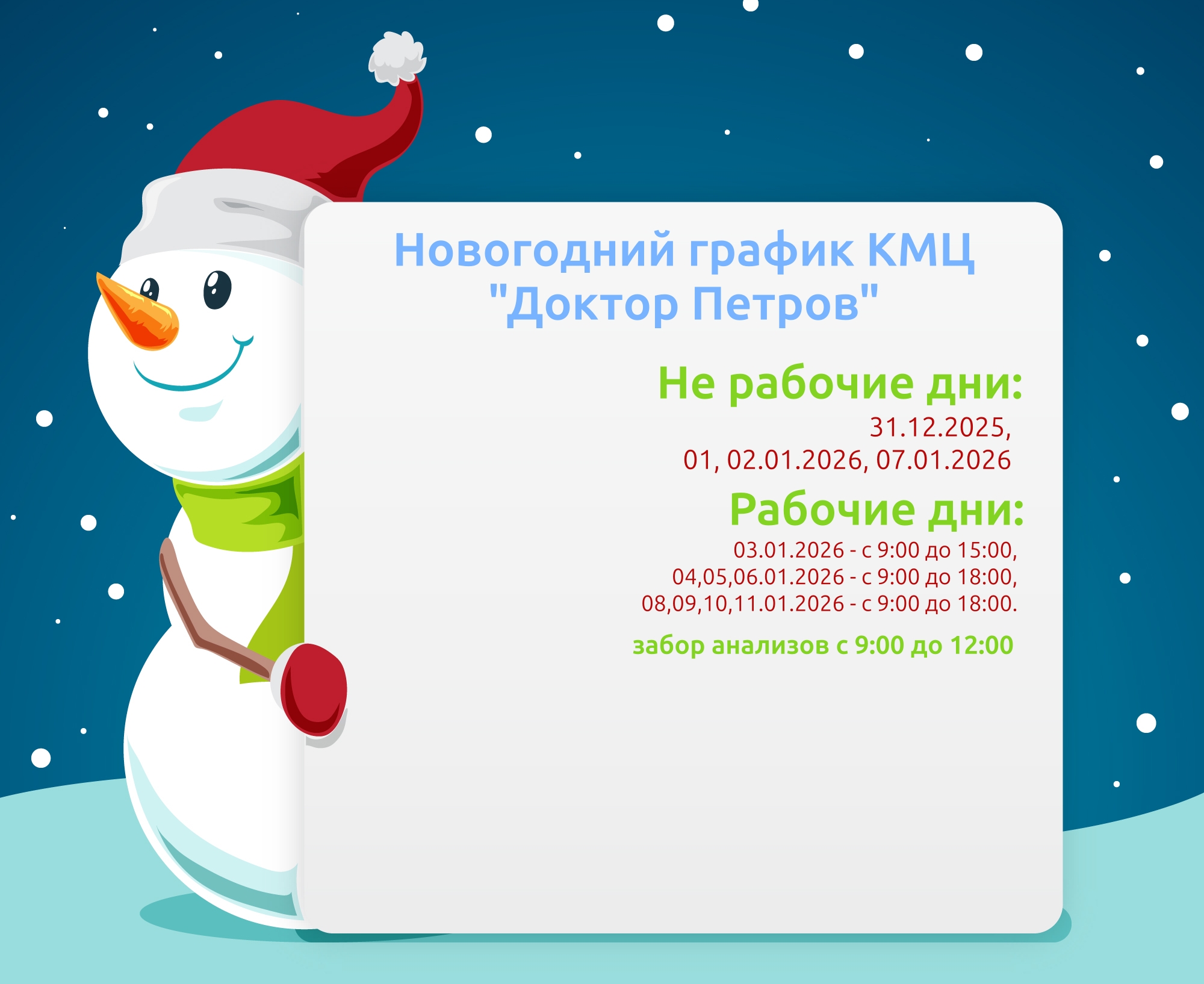 График работы центра: Пн. - Пт.: с 8.00 до 20.00 Сб. - Вс.: с 9.00 до 18.00 Забор анализов: ежедневно с 8.00 до 15.00